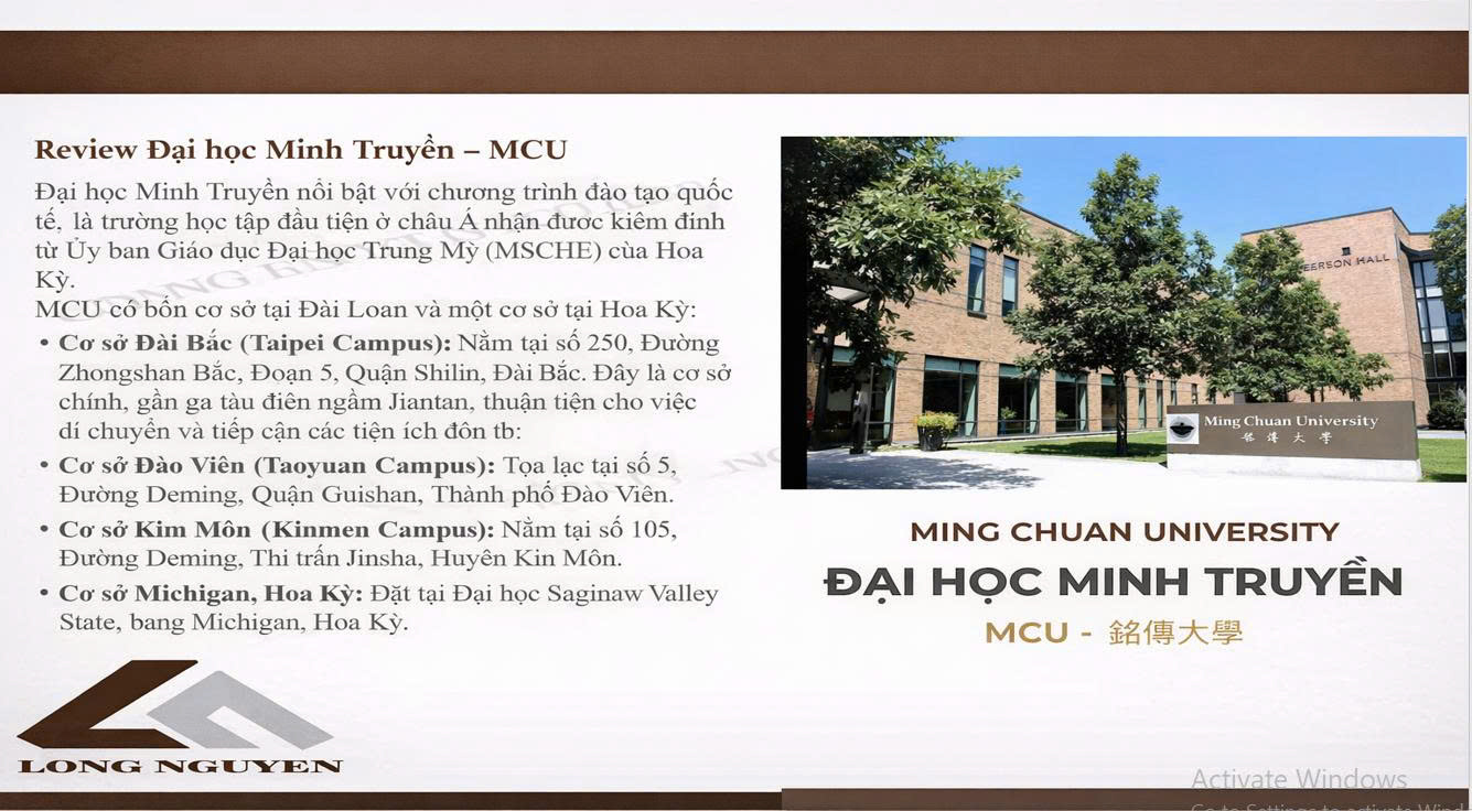 Ming Chuan University (MCU) là một trong những trường đại học nổi bật tại Đài Loan với chương trình đào tạo mang tính quốc tế. Trường là đại học đầu tiên tại châu Á được kiểm định bởi Ủy ban Giáo dục Đại học Trung Mỹ (MSCHE) của Hoa Kỳ, khẳng định chất lượng đào tạo đạt chuẩn quốc tế.