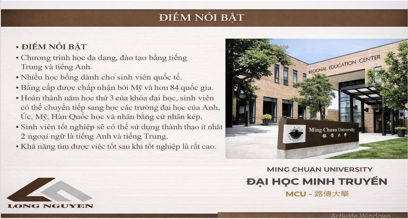 Với chương trình đào tạo quốc tế, cơ sở vật chất hiện đại và cơ hội nghề nghiệp rộng mở, Ming Chuan University là lựa chọn lý tưởng cho những sinh viên mong muốn học tập và phát triển trong môi trường toàn cầu.
