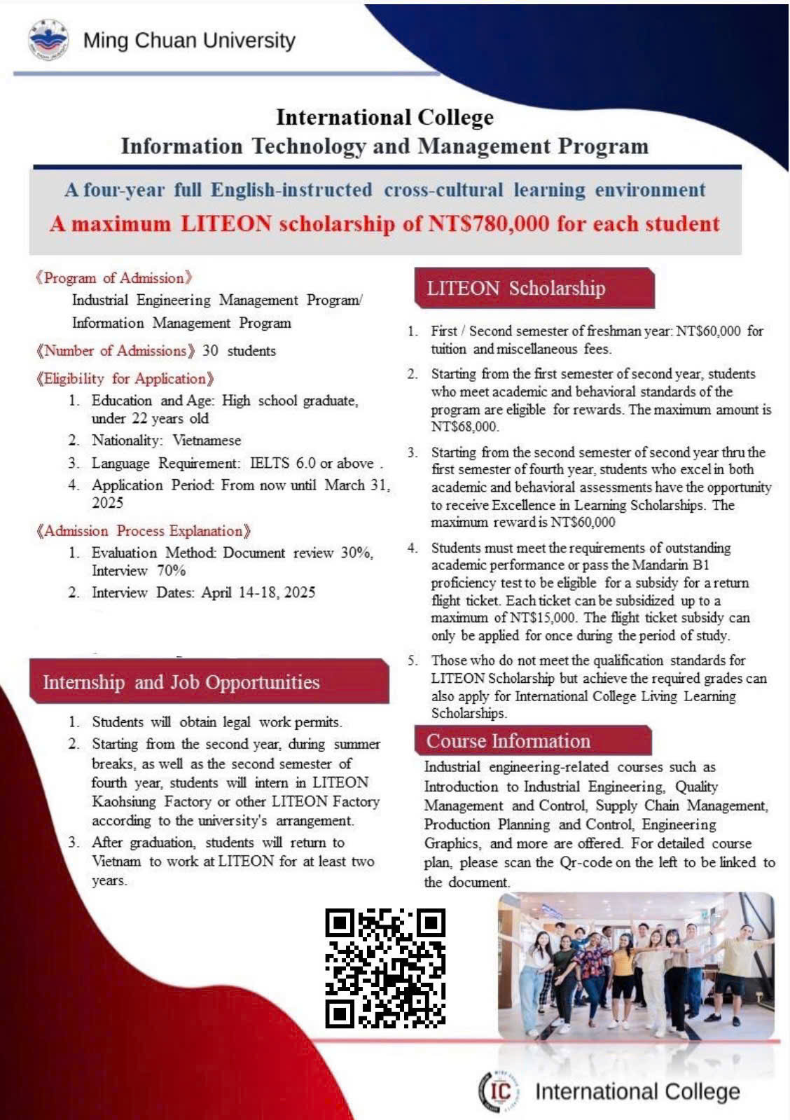 Ming Chuan University (MCU) proudly offers an International Bachelor’s Program designed specifically for Vietnamese students, providing a global learning environment with 100% English instruction throughout the entire 4-year program.